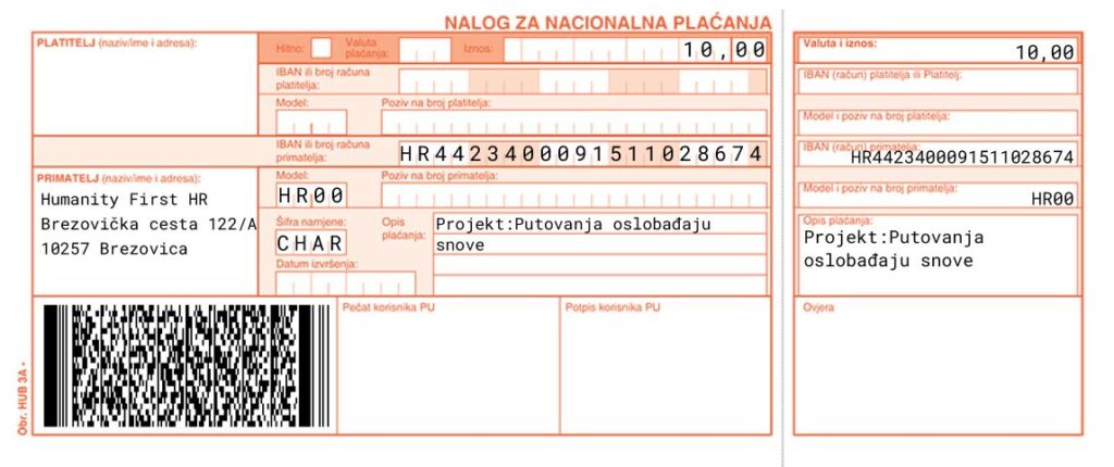 *Molim, imate na umu kako je na uplatnici naveden iznos od 10 € kao primjer donacije. Taj iznos možete promijeniti prema vlastitoj želji u aplikaciji koju koristite.